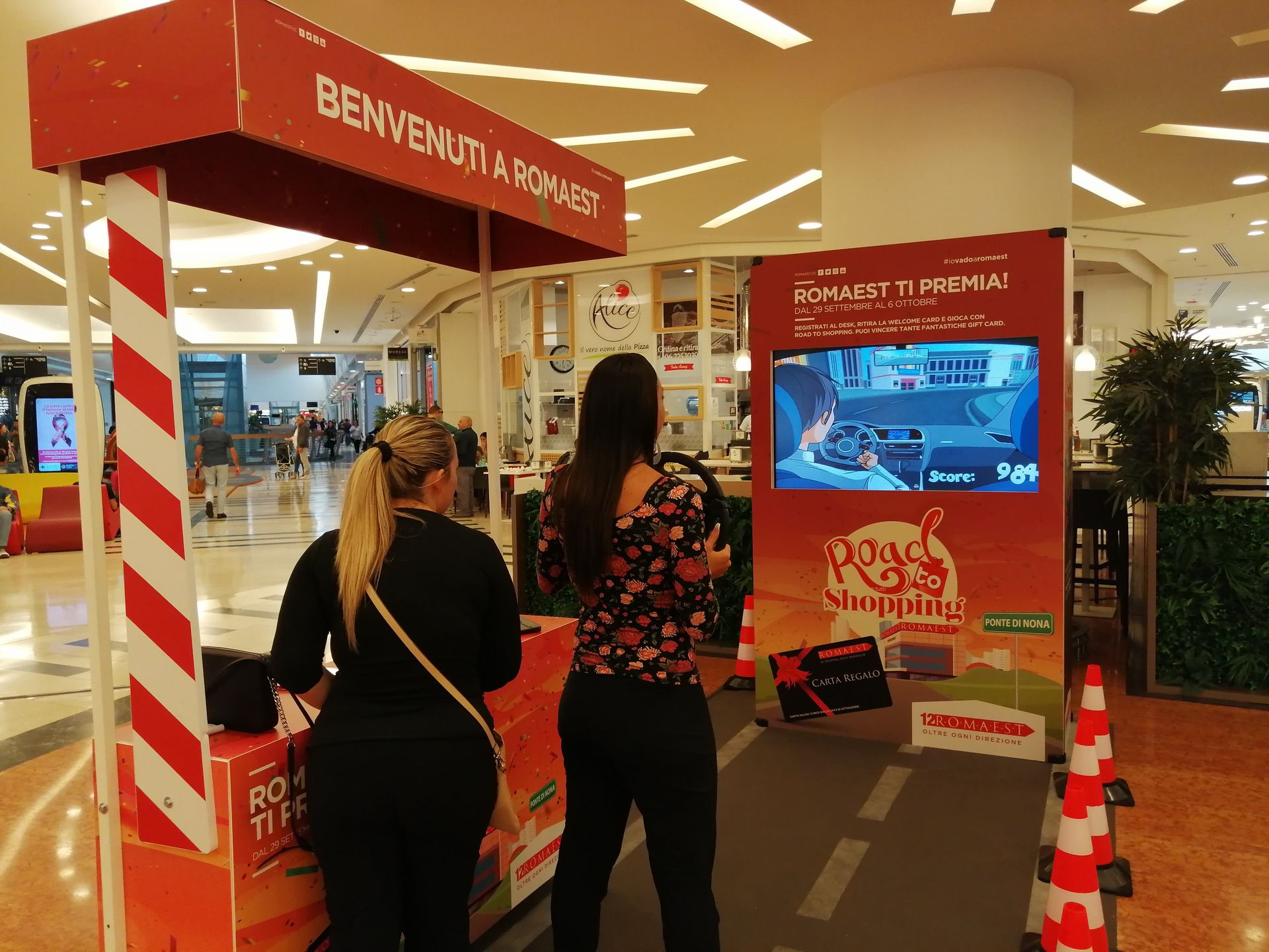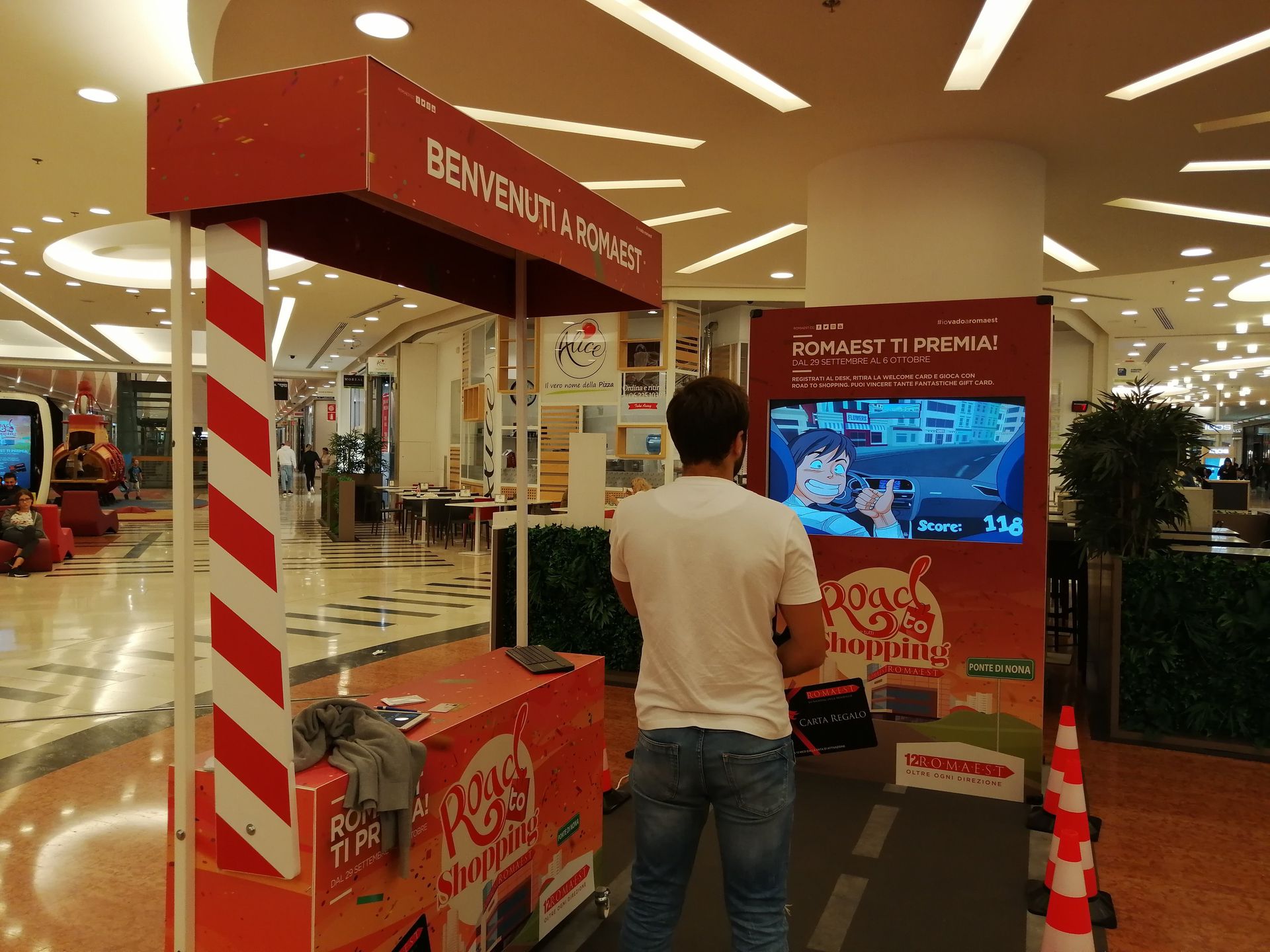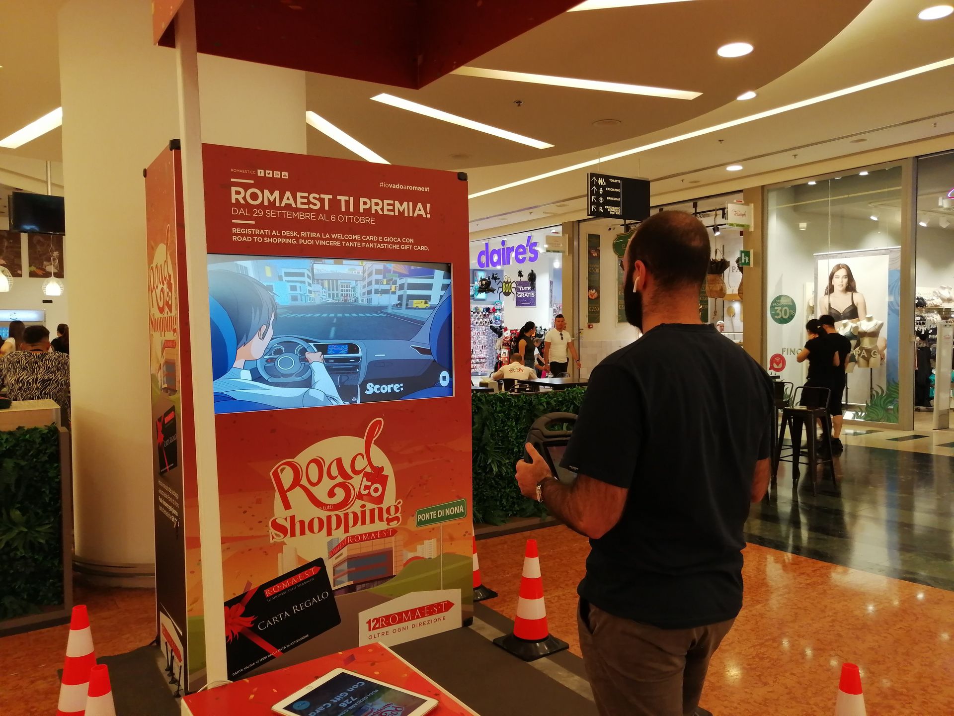 L’attività di gioco si è svolta di fronte ad un totem brandizzato completo di schermo. I clienti che si sono posizionati di fronte allo schermo hanno ricevuto un volante, ritrovandosi a percorrere, in un videogame brandizzato nelle grafiche, una strada in cui raccogliere alcuni oggetti “simbolo” dello shopping a RomaEst. Al termine dei 30 secondi della sua corsa, il giocatore ha scoperto il punteggio totalizzato, in base agli oggetti raccolti. In base al punteggio sono state assegnate gift card del valore di 5, 10 o 100 Euro spendibili nel Centro Commerciale.
